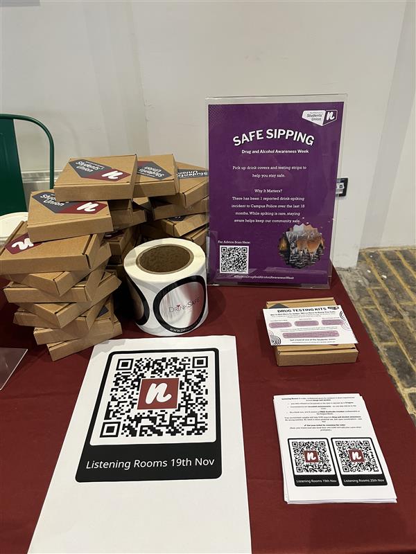 The University of Northampton Students’ Union hosted a hydration station in their students ’union, full of harm reduction resources such as drink covers, hydration drinks and drug testing kits. They also set up listening rooms throughout the week,which is a private space for students to access confidential advice from trained members of staff.