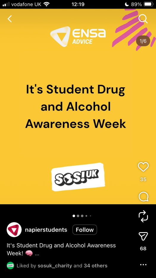 Edinburgh Napier Students’ Association celebrated student drug and alcohol awareness week by sharing harm reduction resources on their social media, with 68 students sharing their post marking the start of the week. That’s a great way to get the message far and wide!